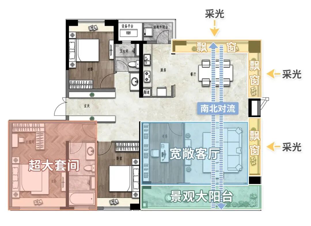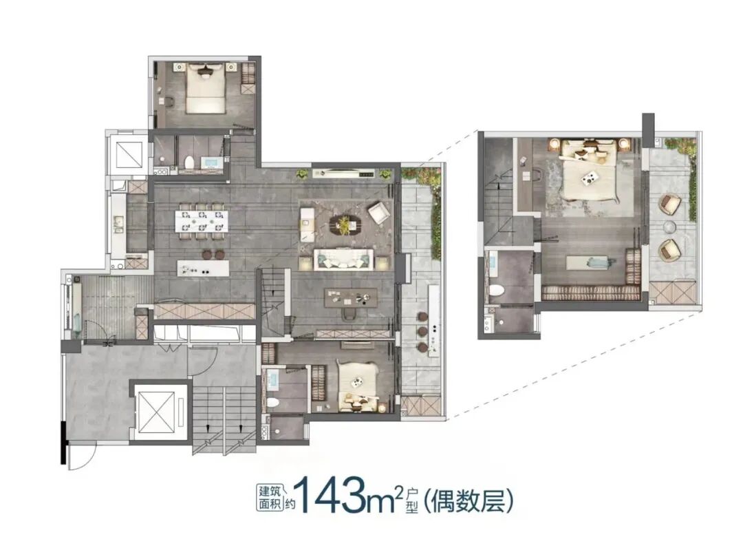 入户旁的大套间直接连着大阳台,给长辈一个晨运的大空间;主卧套房,还有270°转角飘窗。景观方面,两个巨型阳台,两边巨幕观感,约8.9米大阳台+L型生活阳台,搭配窗外的园林景观、乐园景观和江景,简直不要太惬意。