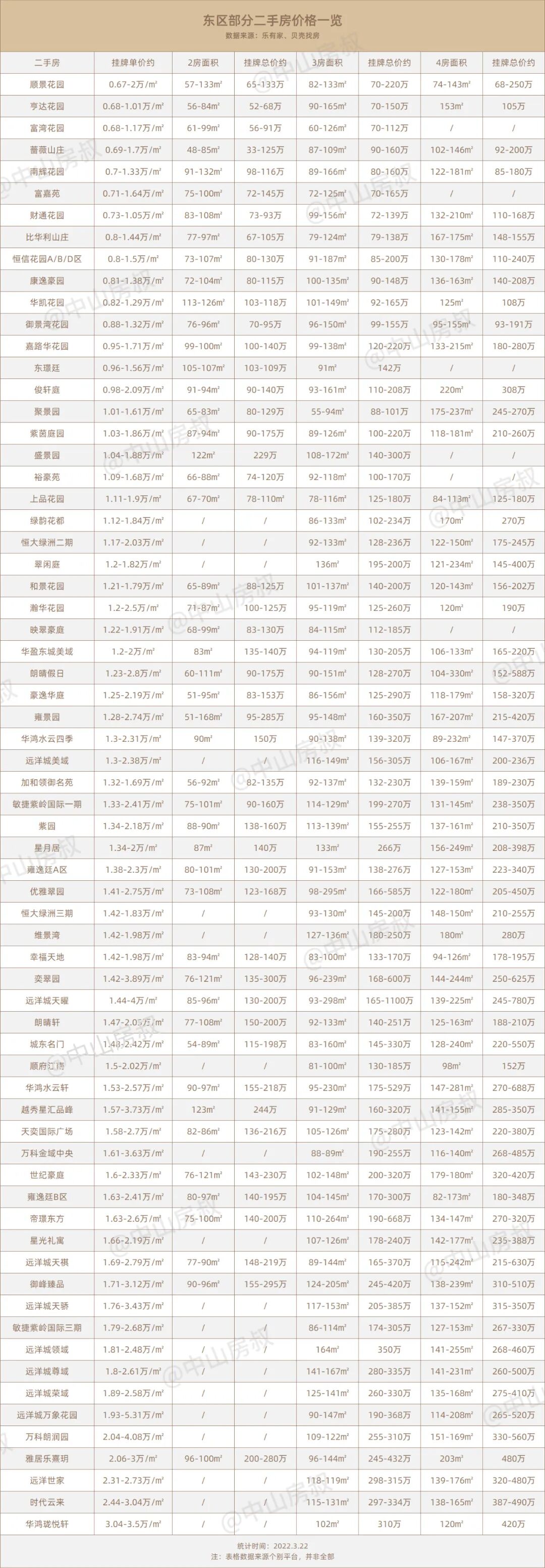 详细了解完东区之后,我们再来聊聊:为什么150万买东区二手房不容易?首先,我们先通过一个表格来看看,东区都有哪些二手房小区(由于个别小区过于老旧,表格中并未记录):