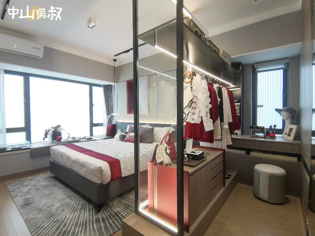 最亮眼的是主套,宽裕程度相当奢侈,独立卫浴、步入式衣帽间皆有。市面上120平才能做到的户型,这里105平就可以。
