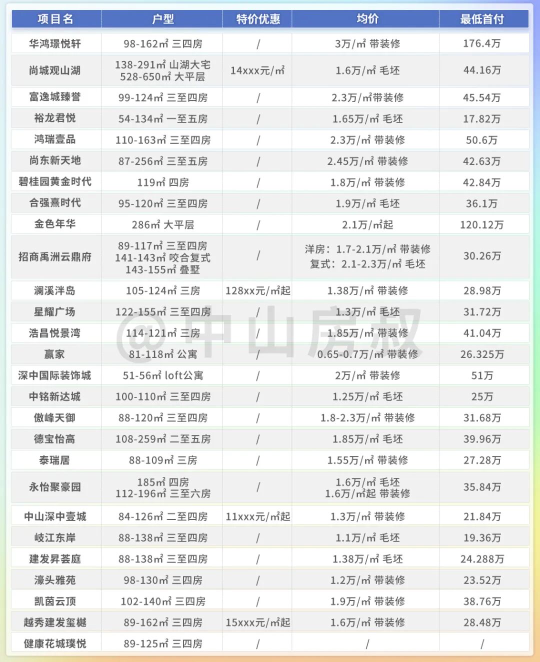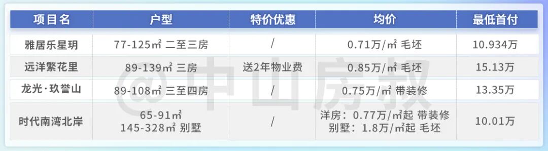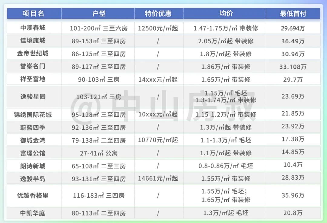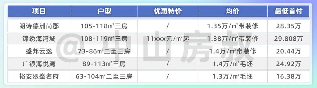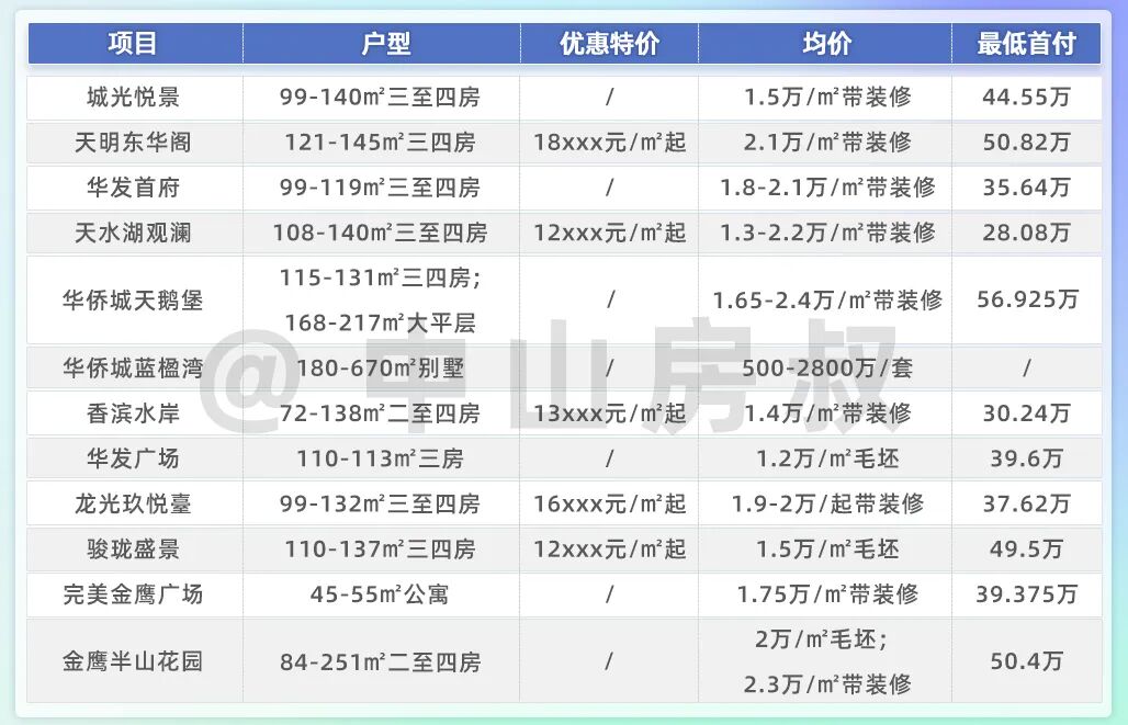 值得注意的是,房叔在统计过程中,还看到有个别项目推出“首期xx万起”、“首付xx万起”的优惠活动。比如中澳春城首期8万起、湾区盛景首期5000元起……