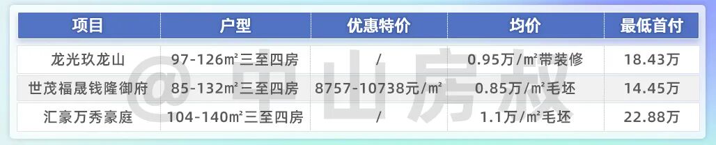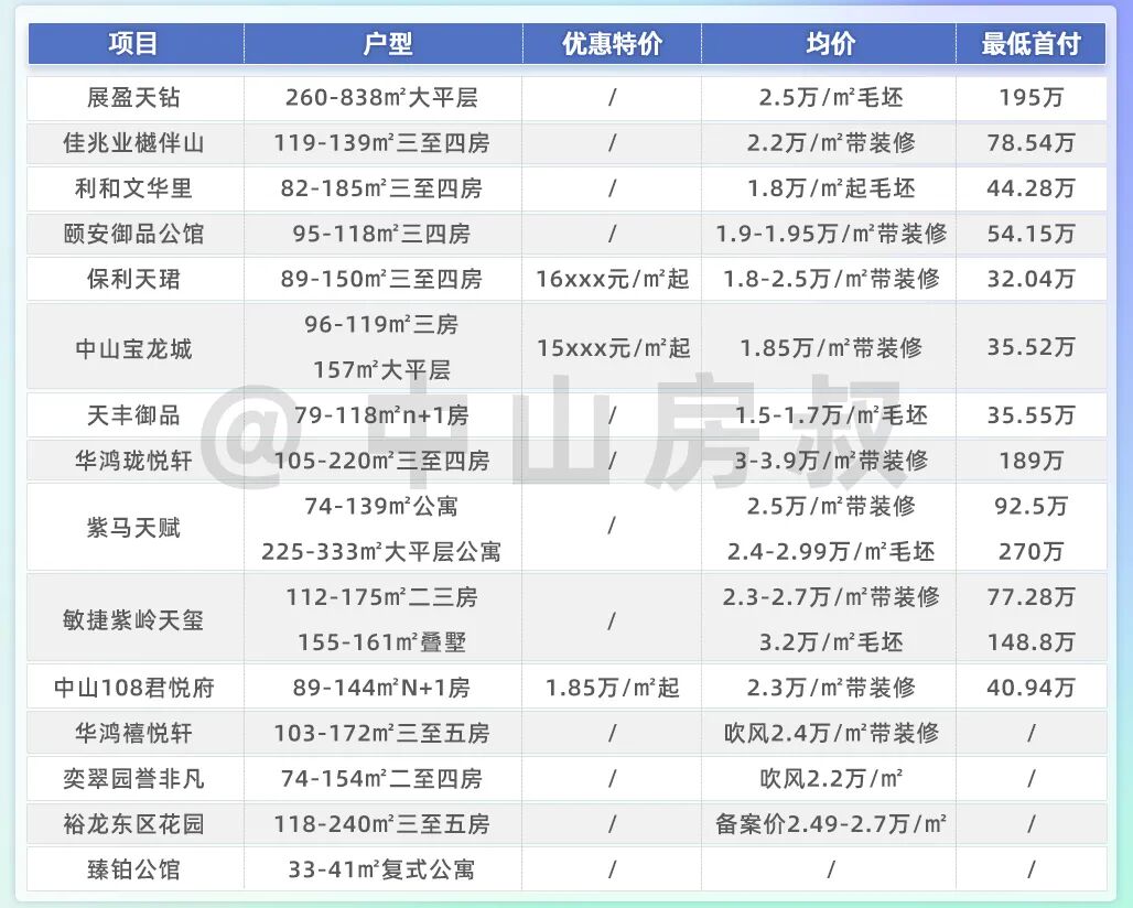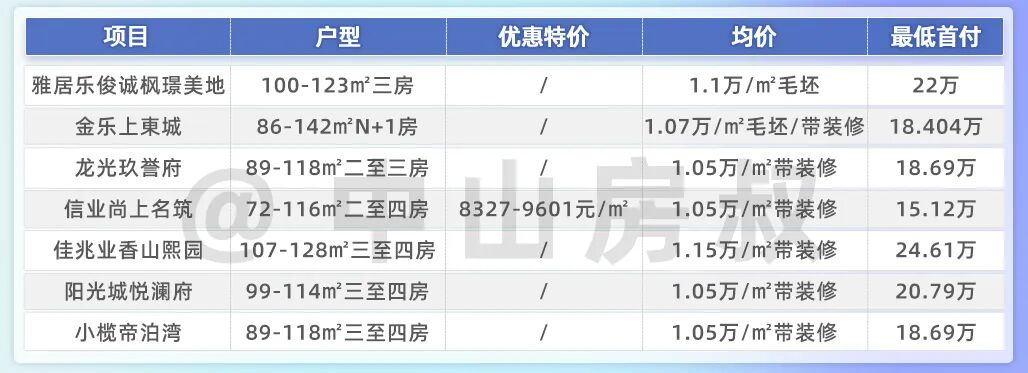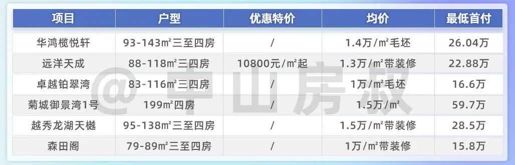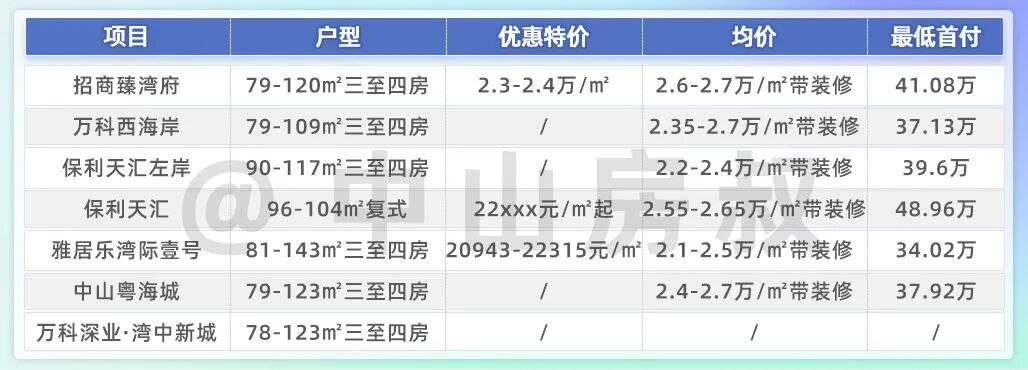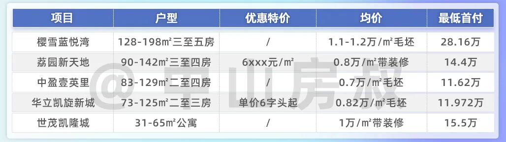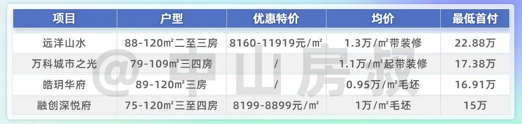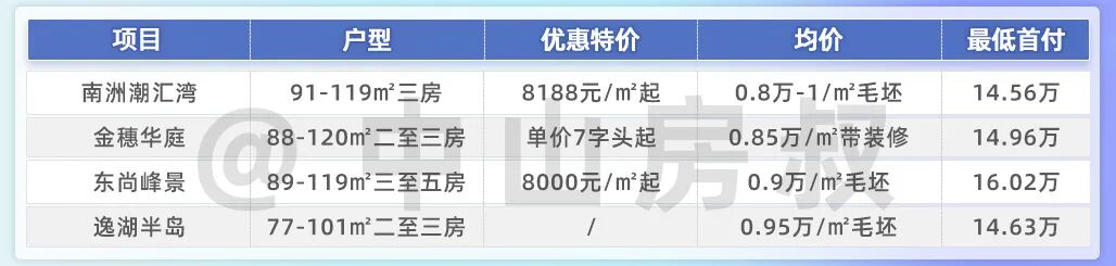 值得注意的是,房叔在统计过程中,还看到有个别项目推出“首期xx万起”、“首付xx万起”的优惠活动。比如中澳春城首期8万起、湾区盛景首期5000元起……