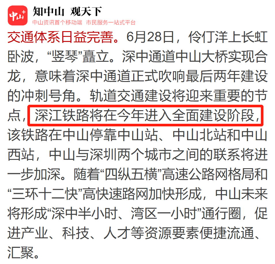 备受关注的深江铁路、广中珠澳高铁,分别经过中山北站和中山站,距离港口都相当近。在港口镇2022年工作计划中提到,今年将全力推动深江铁路开工建设,做好广中珠澳高铁项目前期工作。恰好这2条轨道交通,在最近都迎来飞跃式进展。7月11日,中山+发布文章中提到,深江铁路将在今年进入全面建设阶段。随后,中山手机台发布视频,官方宣布深江铁路将会在年内动工建设。![]()