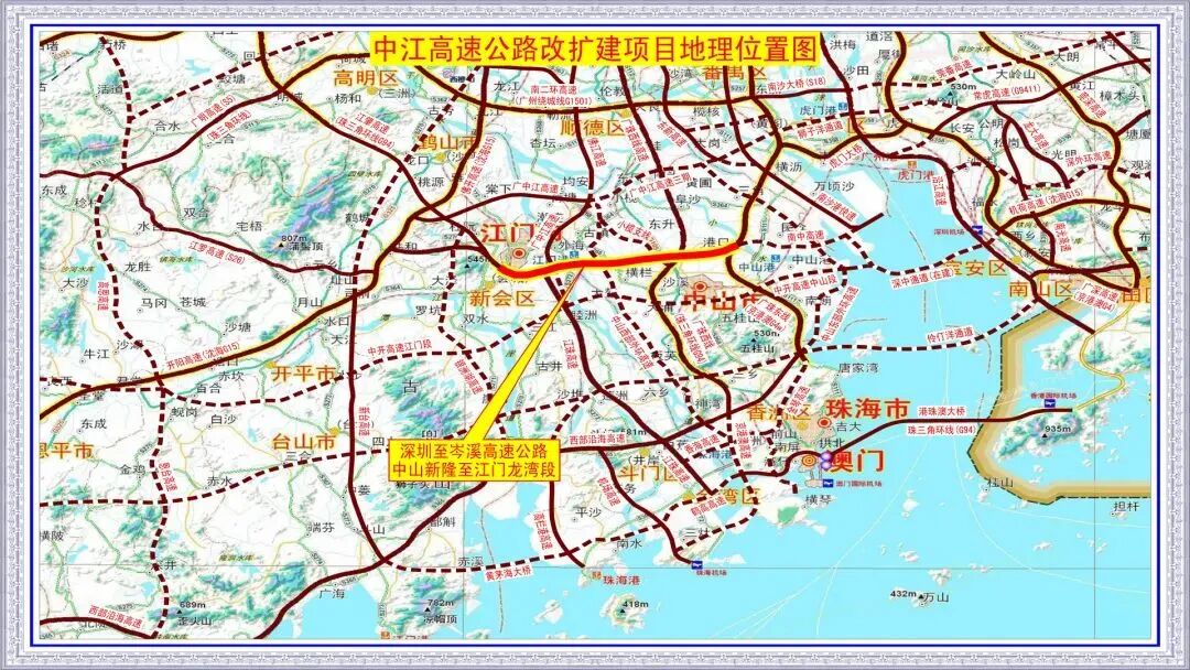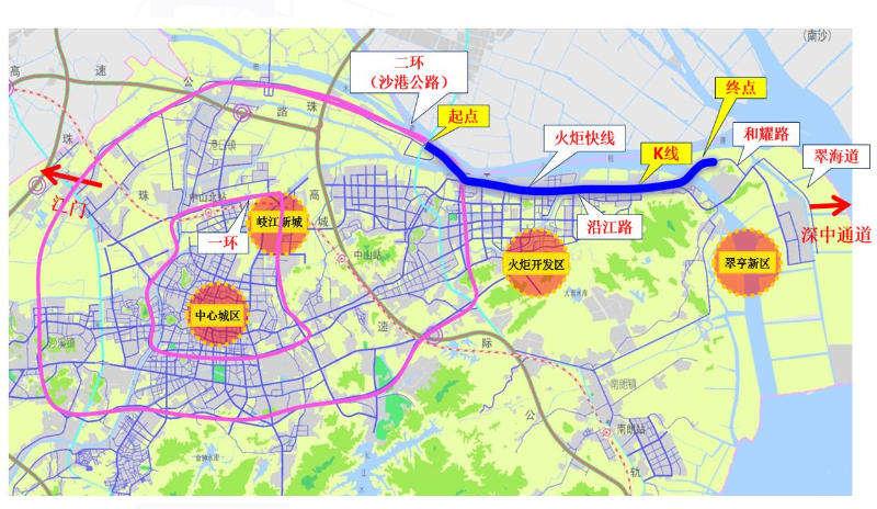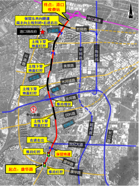 项目起于中山港口镇胜隆村,顺接南中高速,经港口、小榄、横栏、古镇等,终于江门市新会区顺接江鹤高速公路,计划在2024年与深中通道同步通车。