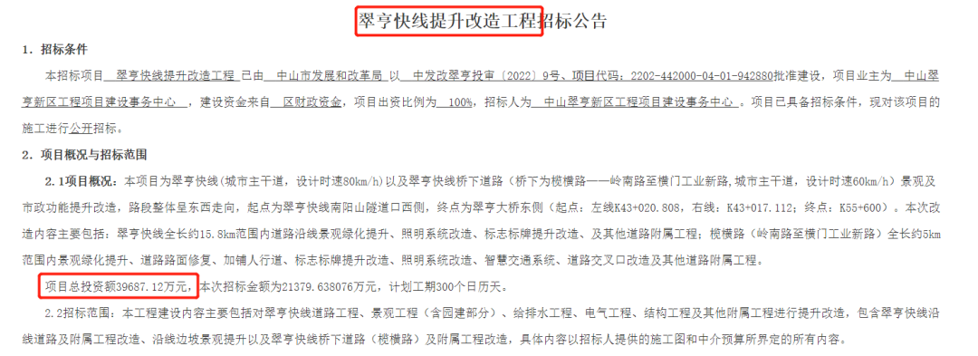 公告显示,预计投资39687.12万元,对翠亨快线及其桥下道路的景观及市政功能进行提升改造。