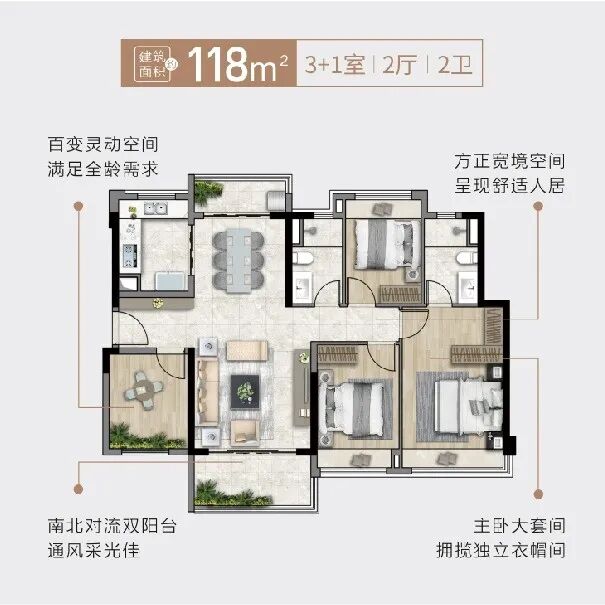 约105平爆款户型,得房率近100%,拓展面积近20平,轻松做出4个创意房间,并享有远高于同面积产品的尺度感,如约6.3米的宽境大阳台,将小区园景一网打尽。