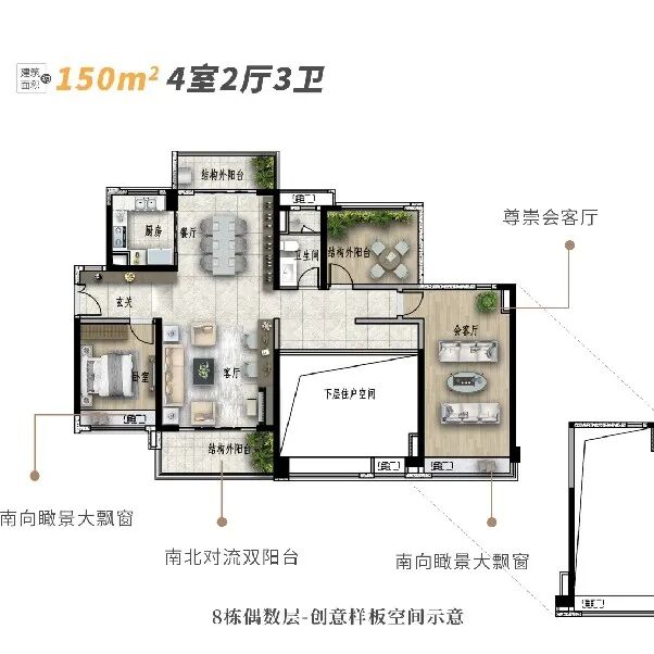 约107平,则是目前东区最小面积的横厅四房,五开间朝南,配置约5.8米大开间客厅,可以说专为刚改、一步到位的朋友量身打造。