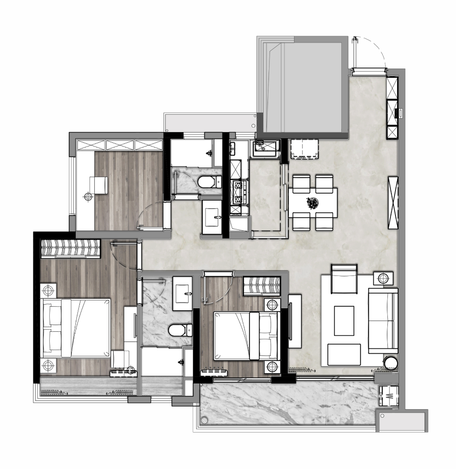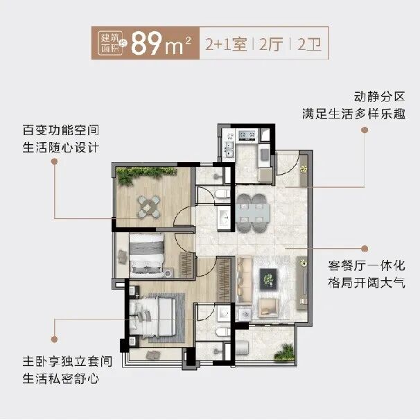 大家看约89平的经典三房,动静分区,主卧享独立套间+270°大飘窗+衣帽间,尺度感丝毫没有因面积小而有所减弱。