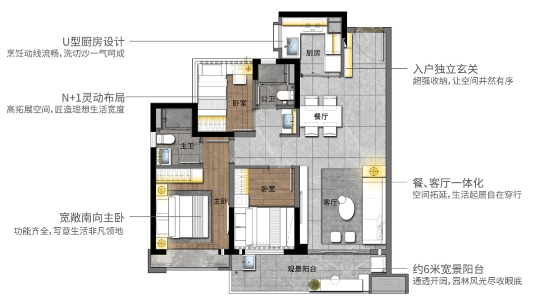 在过去,我们对89平户型,多少有些刻板印象,认为小户型只能与低总价挂钩。89平充其量是紧凑三房,带一个卫生间,阳台几乎全用作晾晒。某些项目更是只顾眼前利润,不惜牺牲产品的采光与通风。毕竟大家认为,刚需勉强上车就很不错了,舒适度、园林、朝向就不要挑剔了。实际上,刚需的试错成本更高,第一次买房相当于All in,不仅自己的积蓄归零,往往还要动用“六个钱包”。一旦买错房,想要挽回过失,相当艰难。璞悦就是要打破这种刻板印象,通过巧妙设计,把小面积玩出“大尺度”的空间感。