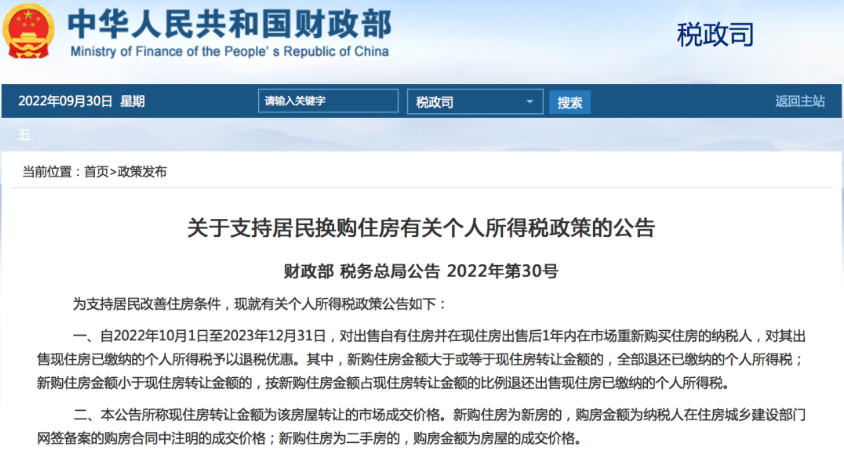 宣布自2022年10月1日至2023年12月31日,对出售自有住房并在现住房出售后1年内,在市场重新购买住房的纳税人,对其出售现住房已缴纳的个人所得税予以退税优惠。