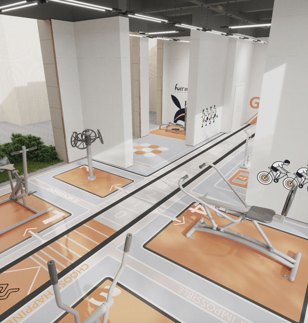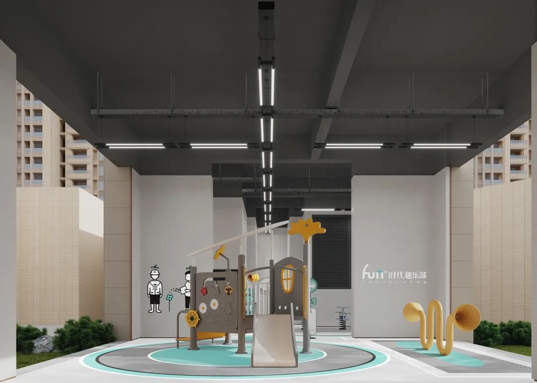 你来看看,在儿童乐园,生动有趣的卡通墙绘,多元的游乐设施,让孩子们可以玩耍、创作、学习,这就是寓教于乐。暴晒或者下雨天,不适宜外出?在棋牌室,老人可以和邻居切磋棋艺,休闲乐活。至于年轻人,健身主题空间就是你的好去处,各种健身器械,让你享受运动的乐趣。对了,项目健身主题空间,会铺上橡胶垫,更安全哦。