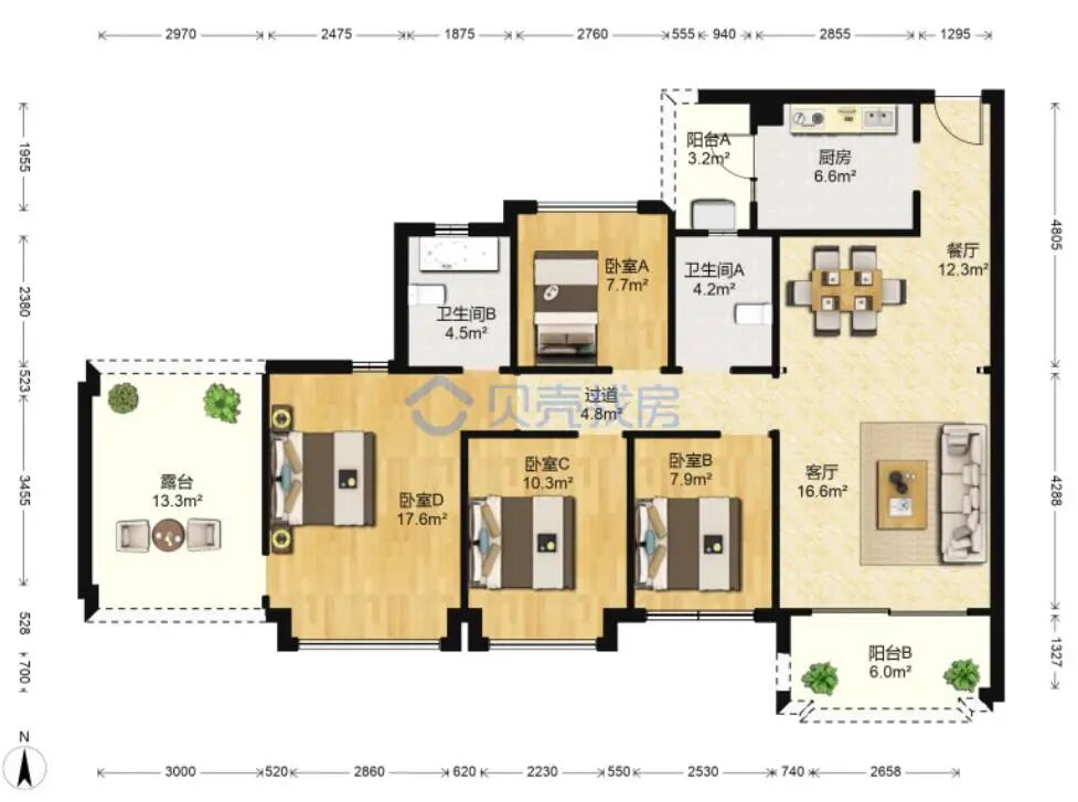 这个户型面积好像不止55㎡,客厅27.7㎡、卧室37.5㎡、卫生间9.6㎡、阳台10.9㎡、厨房6.6㎡、过道4.7㎡,总共97.09㎡。
