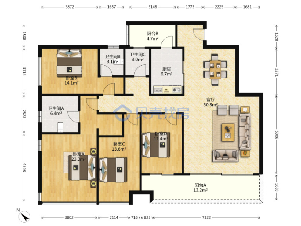 四房双卫双阳台,传统竖厅设计,客厅空间就有31.3㎡。卧室分布在一侧,3个次卧11㎡以上,另一个也有9.2㎡,主卧甚至去到18.5㎡。