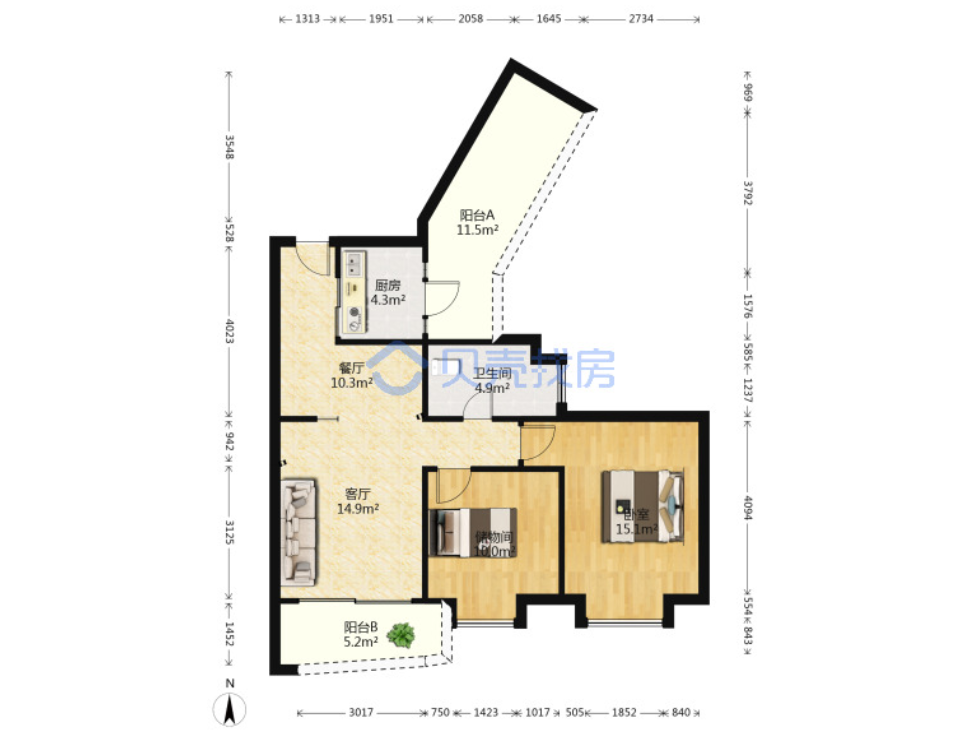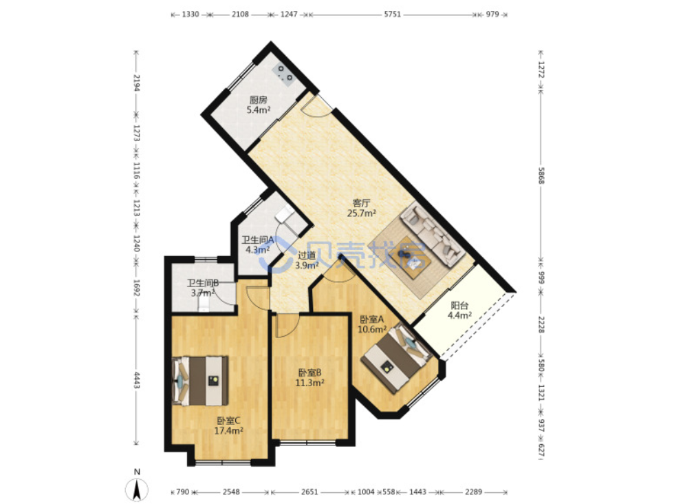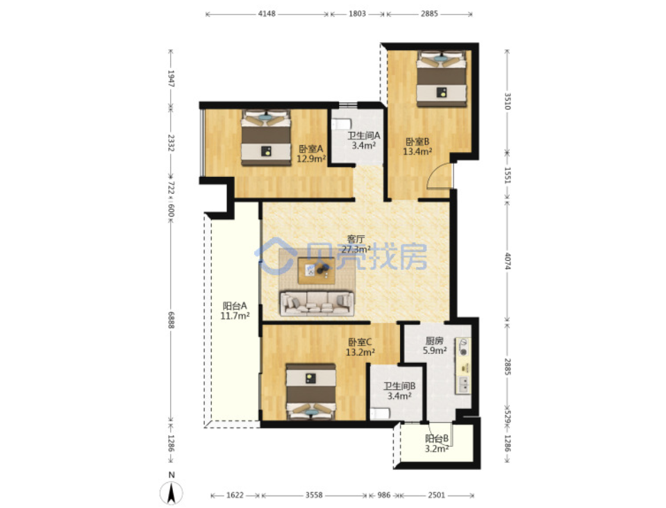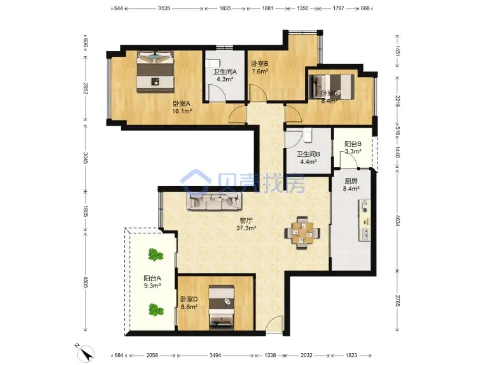看回户型,三房两厅两卫,居然还能做到四开间朝南。但卧室A这个尖角是咋回事,做个定制衣柜也还行。