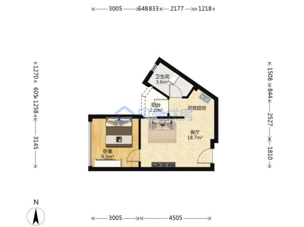这个约50.17㎡一房,虽然厨房不规则、卫生间是梯形,但好歹客厅和卧室是方正的。