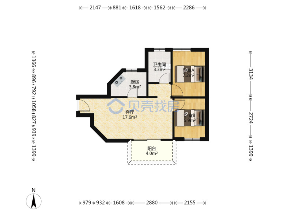 两个卧室一南一北,都挺方正。南向卧室只有5.9㎡,若是床、衣柜、床头柜等都备齐,那估计转身都难,不过做个书房还是挺不错的。