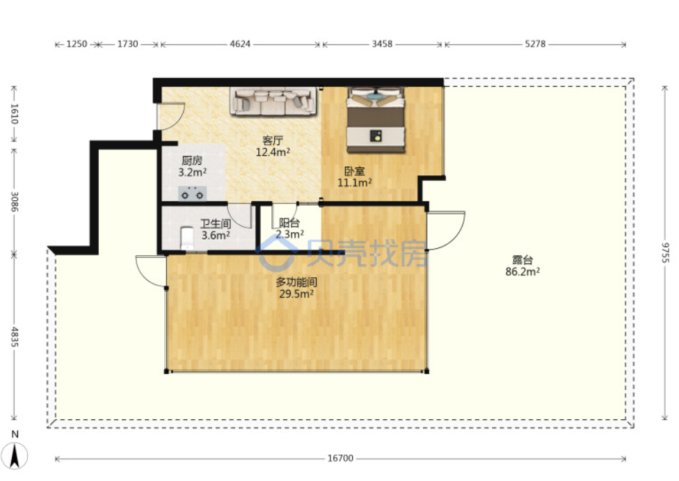 咦,吃饭去哪里吃?别担心,阳台面积够大,有约22.9㎡,你跟上一个户型一样就行,在阳台放个桌子。