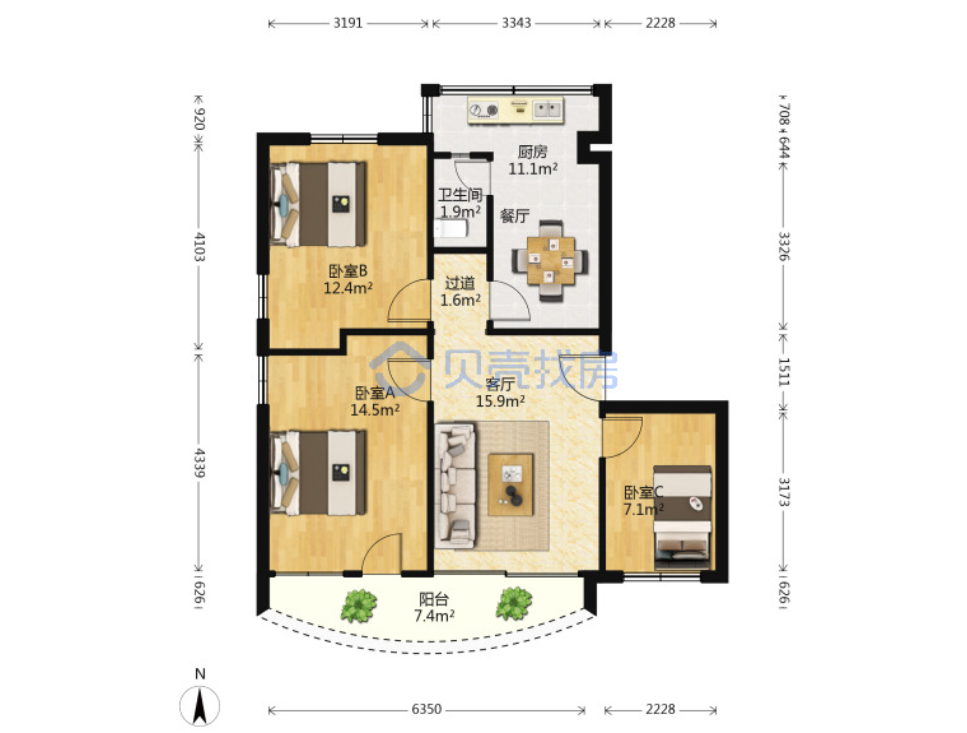 其实整个户型看起来还挺正常的,三开间朝南、动静分区,唯一奇怪的就是厨房旁那个150°转角阳台。