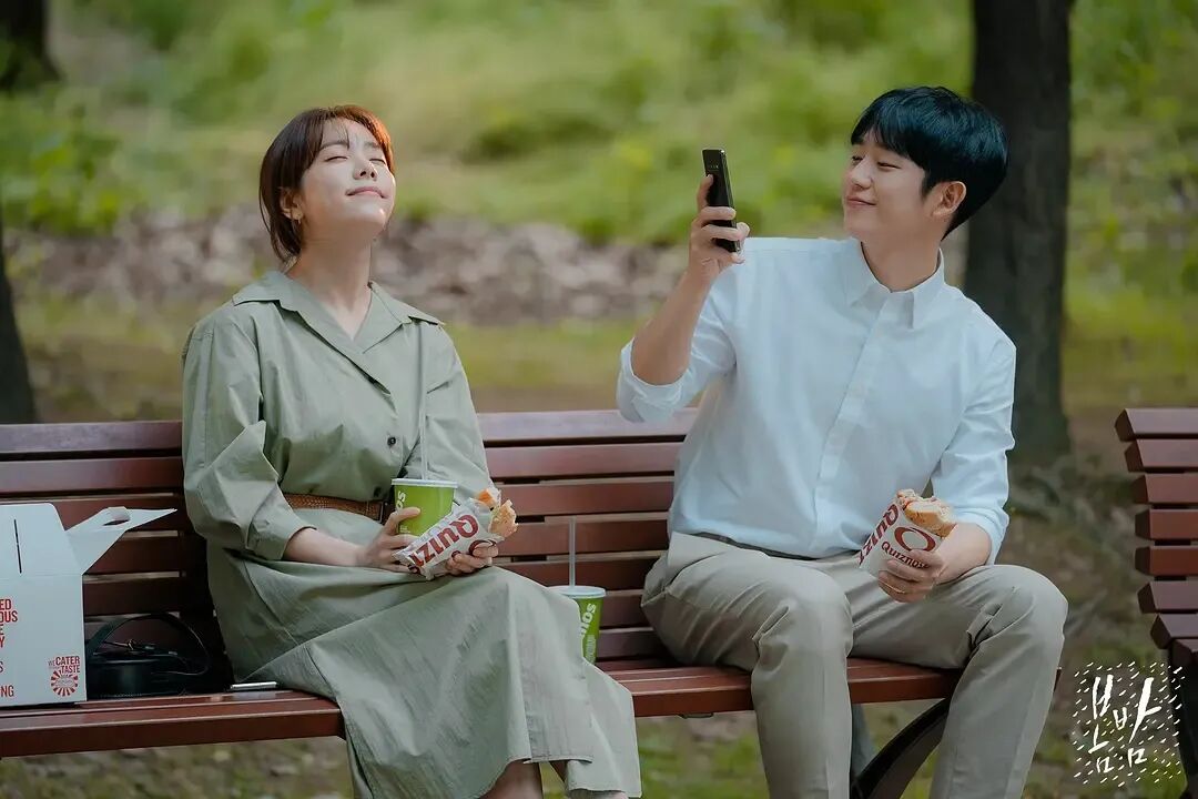 饱和度低的豆绿色连衣裙也非常特别,洋溢着早春气息。清新脱俗又不张扬,就像李静仁和刘智浩的爱情状态。