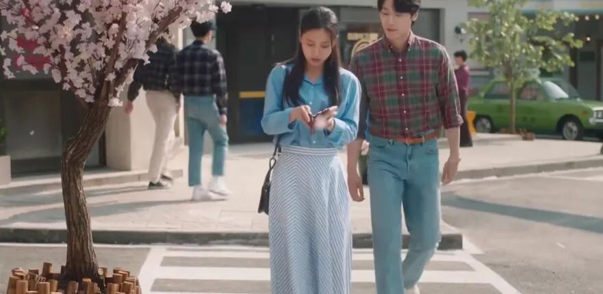 男主复古格子衬衫+牛仔裤,搭配女主的蓝色系穿搭,以人物为视觉中心,配上画面左边的樱花粉、背景的绿色小车和树。整个画面颜色虽多,但复古滤镜也使饱和度较低,看起来是和谐的。