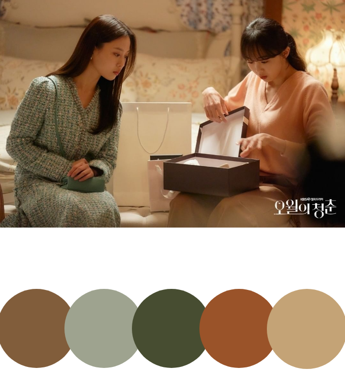 色彩与穿搭方面有一点《半之半》的温暖,还有一点《花样年华-生如夏花》的复古质感。