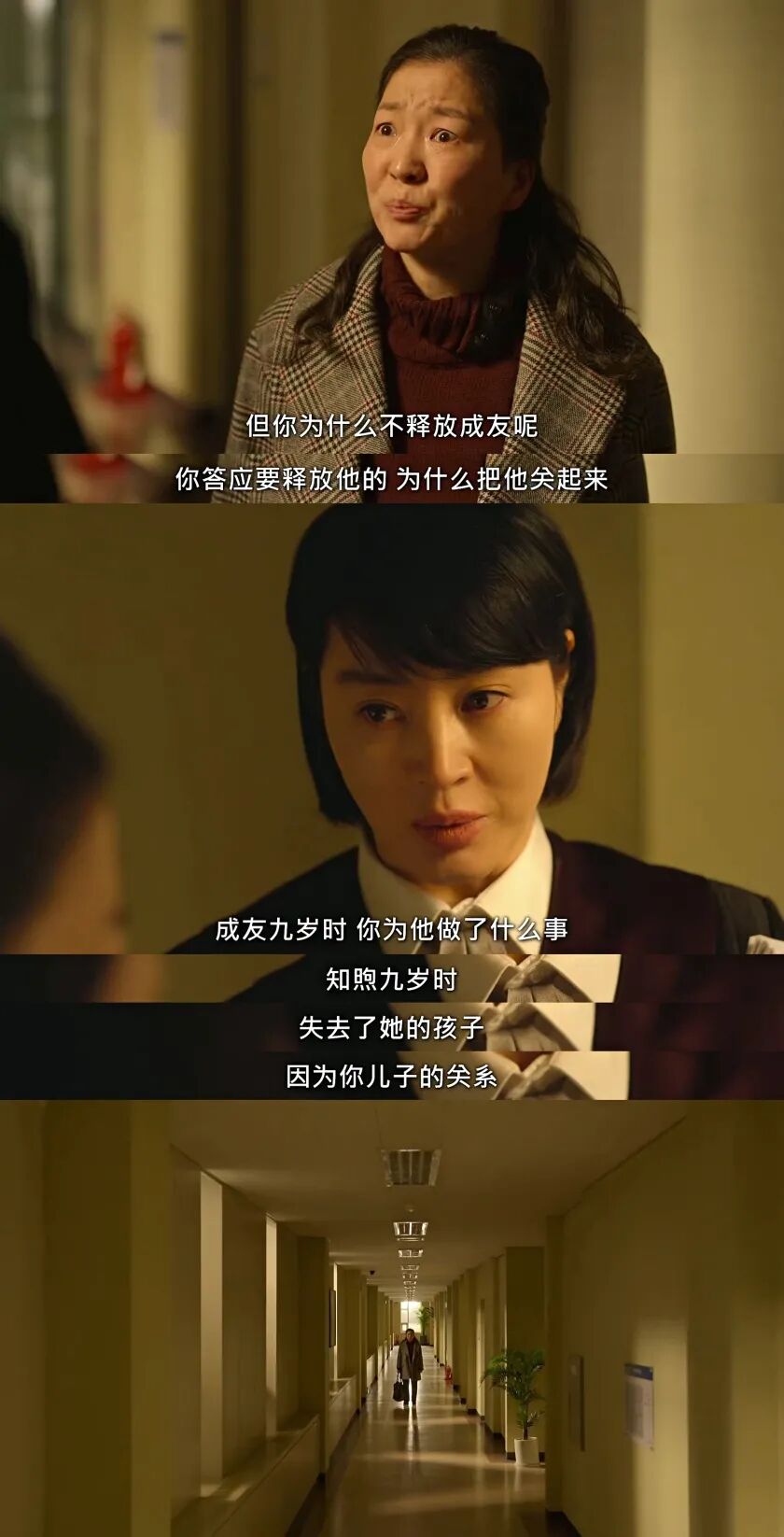 作为法官,也是少年犯受害者遗属的沈恩锡,控诉着新来的部长法官不负责,她直视镜头,铿锵有力的台词,不仅仅是对剧中的部长一人所说,也是对现实中只求效率、缺乏使命感的少年犯法官们所说。