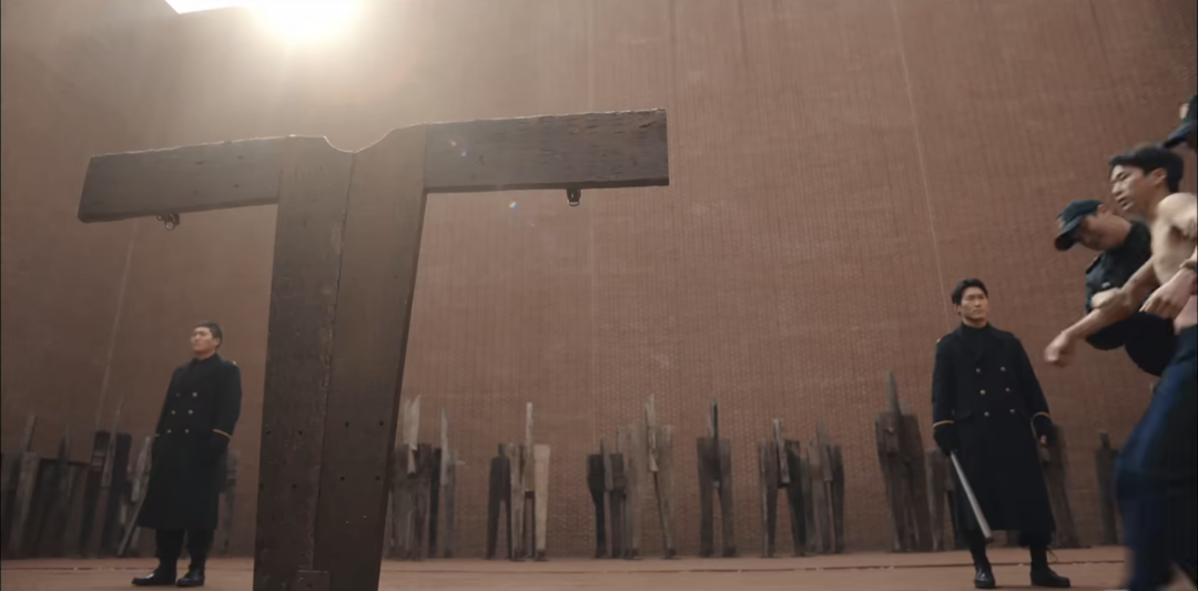 笞刑的空间是由四四方方的高墙组成,四周封闭、上面敞开,阳光照在木板上,有一种半现代、半原始,“文明倒退”的荒诞之感。