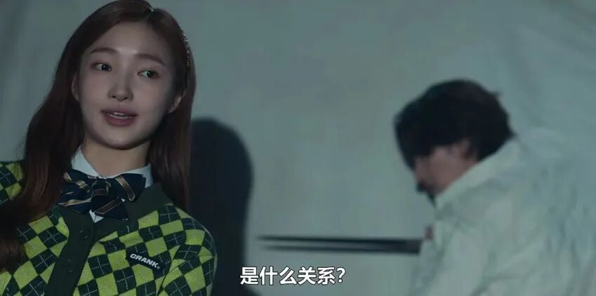 这一幕,女高中生在画面右边的前景,画面占据的比重大,看似强势,但后面的影子却在画面最左侧,且正处于受威胁的状态。这个画面表现了充满威胁性的、紧张的心理战。