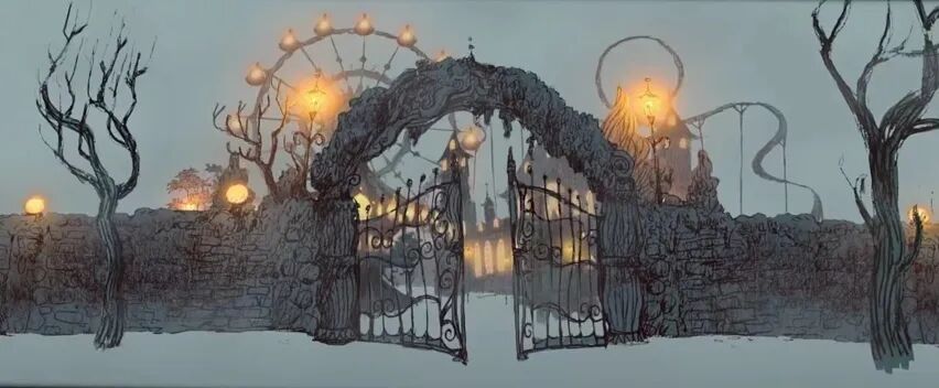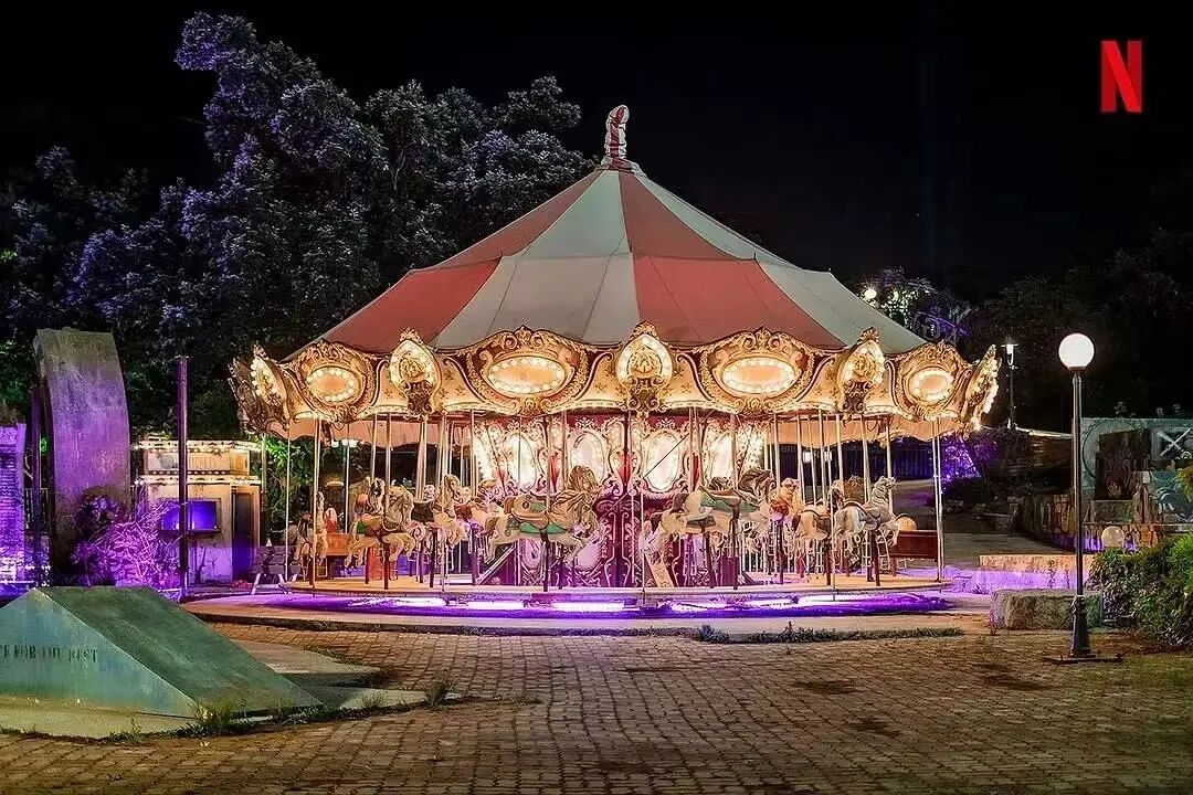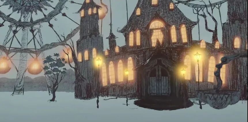 开头用讲惊悚故事的形式,一下把人拉进神秘的废弃游乐园,动画加强了黑暗童话的氛围感。一开始就奠定了这部剧的风格,魔幻中带点悬疑、还有一些童话色彩。