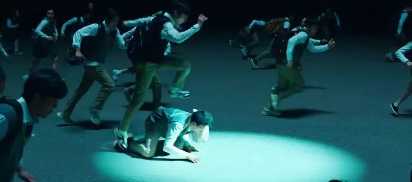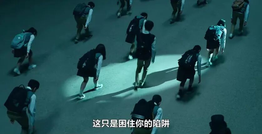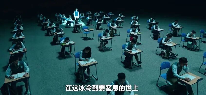 灰暗的色调、没有边界的黑暗,孩子们整齐划一的、丧尸一般的举动;与其他人逆行的、垂头丧气的红书包孩子······