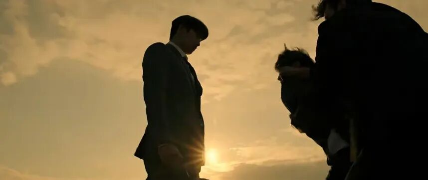 下面这个镜头更明显,太阳在画面正下方,就快要落下了,仰角拍人物剪影,申代理的身形显得高大处于强势,而尹炫优是绝对弱势,落下的太阳是即将迎来的死亡。
