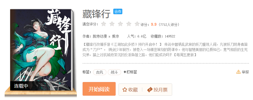 而且这还真是个漫改作品。游戏改编自漫画《藏锋行》,这是一部武侠题材的作品,目前在腾讯动漫连载。虽然6.6亿的人气在这一平台上算不上爆款,但评分足有9.9分。目前漫画的介绍中已经加入了改编游戏的宣传消息。