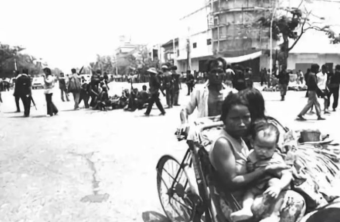 5月5日,西哈努克亲王在北京宣布成立「柬埔寨王国民族联合政府」,是为柬埔寨的流亡正统政权。同日,中国对该政权予以承认,红色高棉也宣布承认该政权为柬埔寨的合法政权。随后西哈努克与波尔布特联手,建立了「柬埔寨解放统一战线」,正式开始了他的复国、复仇斗争。多年后西哈努克曾经提到过:“我奉行的宗旨是不与美国人合作,也不与共产主义者合作。但让我最终选择了红色高棉的原因只有一个,就是朗诺。”有了西哈努克背书的统一战线,瞬间便在柬埔寨下层民众中获得了空前的支持。饱受战争之苦的农民纷纷加入了统一战线的阵营,成为了红色高棉的作战力量。然而西哈努克明白,他一但回国,便可能随时面临被红色高棉“意外死”。于是他选择了继续滞留中国,以流亡政府的身份支持统一战线的活动。1975年4月,红色高棉攻占首都金边,占领了柬埔寨全境,柬埔寨复国战争宣告胜利,民主柬埔寨正式建国。▲被迫迁移的百姓