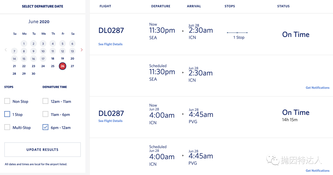 虽然没有看到正式的官宣,但是美国航司这边的中美航线复航计划已经是板上钉钉的了,而目前来说美联航将会复飞旧金山 - 上海的航线,具体班期未知。而达美方面,则是会复飞西雅图 / 底特律 - 仁川 - 上海的航线,进入达美航空官网的Flight Status就可以看到西雅图 - 仁川 - 上海最早的航班安排在了6月25日。