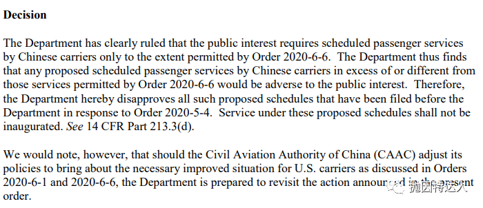 但是结论就是美国交通部否决了上述航司提出的排班安排,并且继续按照2020-06-06的公告来执行:中国航司的中美航线一周最多保持4班。但是下图公告的第二段也是和之前一样保持了开放的态度,只要中国民航局能改善中美直飞航班现状的话,随时可以更改这个公告。