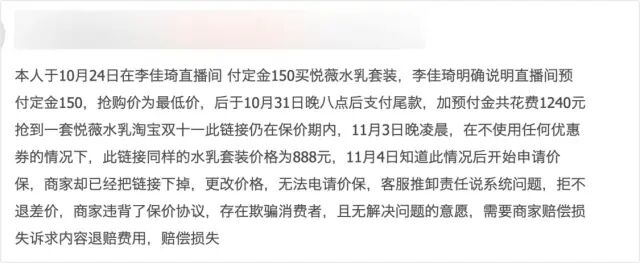 根据维权的消费者们透露,直播中李佳琦表示,直播间预付定金150元抢购,抢购价为最低价。消费者预付定金后,在10月31日晚八点后支付剩余尾款。