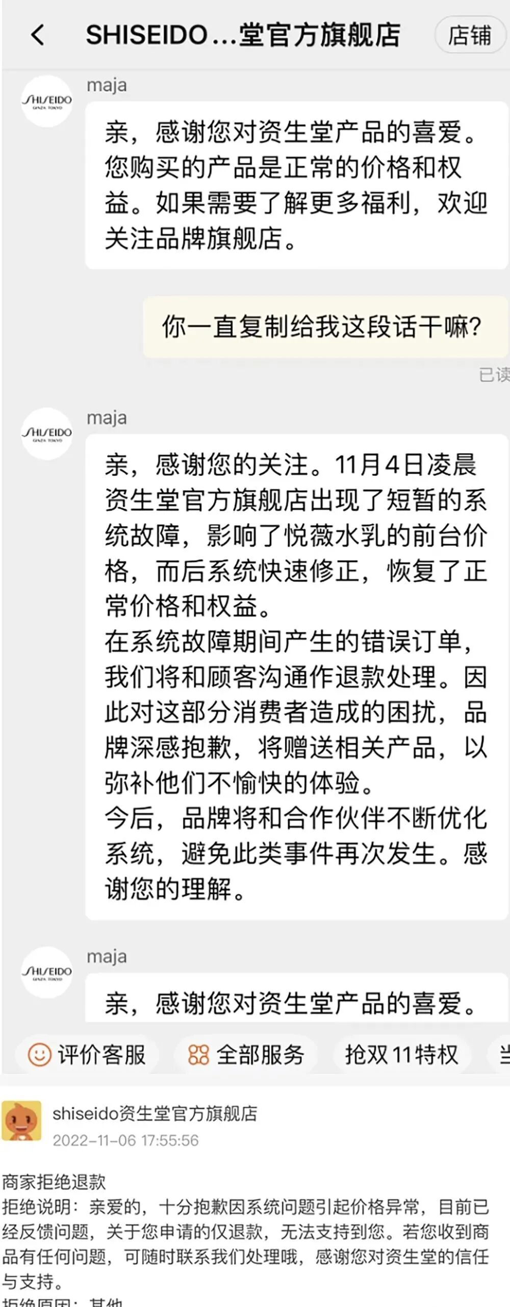 针对资生堂被指将异常订单免费赠予的情况,11月7日下午,资生堂中国官方客服回应澎湃新闻称,资生堂中国总公司已向资生堂天猫旗舰店核实了该情况。该客服复述了4日晚天猫旗舰店发布的公告内容,对于将异常订单免费赠予的情况,该客服并未直接回复,而是多次强调,消费者在李佳琦直播间购买的是正常的价格和权益。而资生堂官方旗舰店铺人工客服则回复,“十分抱歉因系统问题引起价格异常,目前已经反馈问题。关于您咨询的问题,我们仍在积极的反馈处理中,还请您耐心等待,感谢您的支持和配合。”