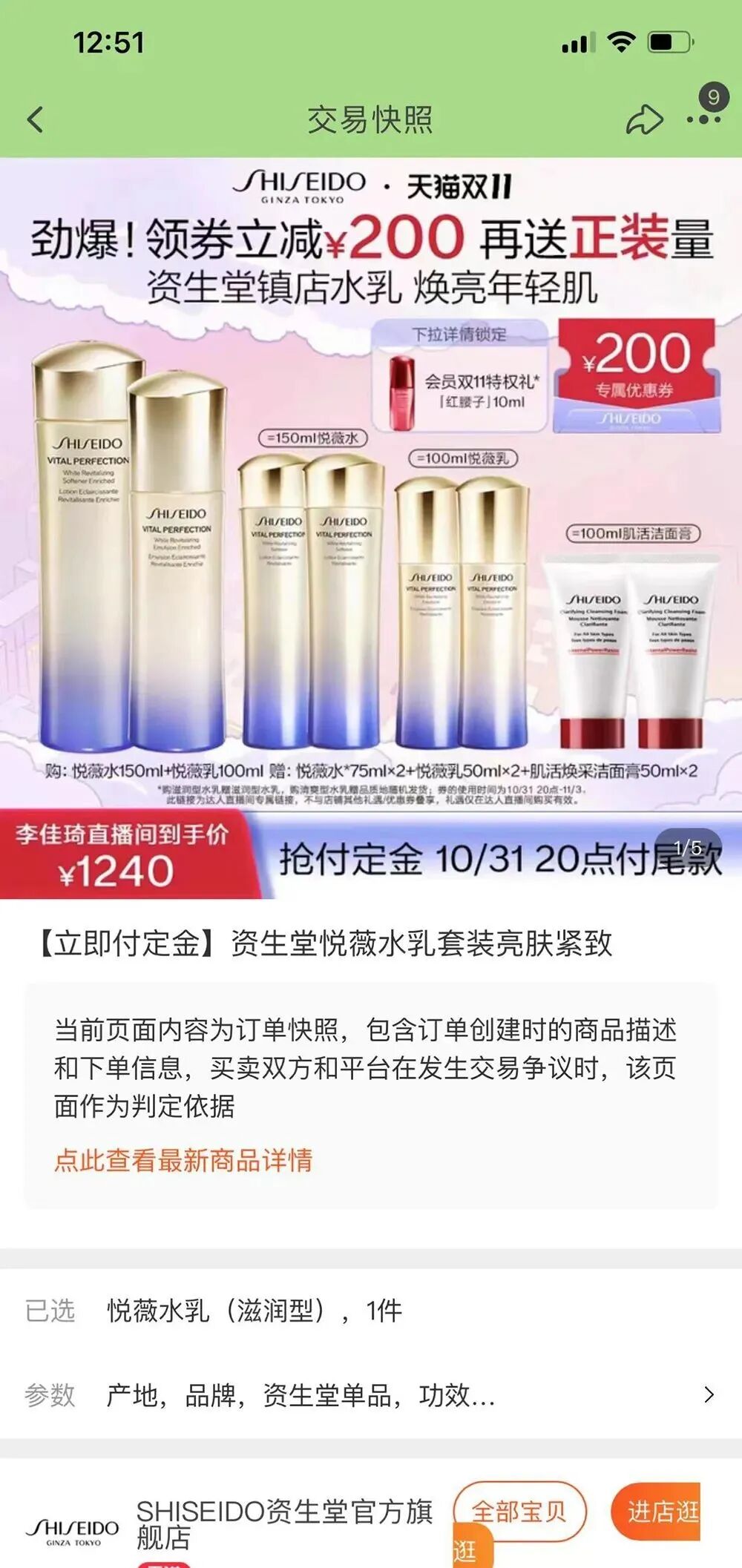 不过,资生堂官方旗舰店很快就下架了该链接,并将价格恢复至1440元。尽管只有几分钟,但还是有不少“幸运”的消费者买到了888元的悦薇水乳套装。