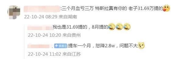 中新经纬在特斯拉评论区注意到,针对此次降价,不少网友大呼“心塞”。有网友称“无语,提车一周降八千, 一个月一万四。”“三个月血亏三万,特斯拉真有你的,31.69万提的”“9.12提车到现在,一个半月不到降了两次价,差了三万六,割了一波又一波,我对特斯拉是一点忠诚度都没有了,对这个品牌好感度也是降到0点”。