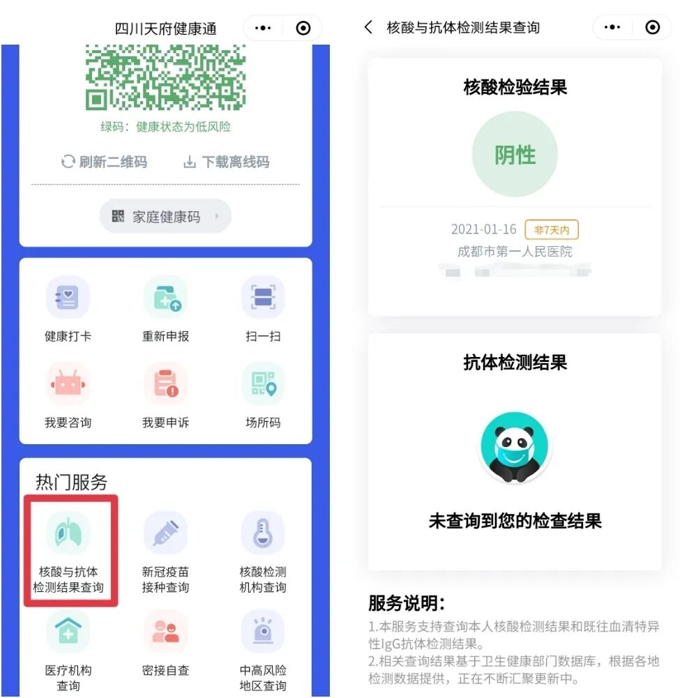 在“四川天府健康通”小程序首页的热门服务中,点击“核酸与抗体检测结果查询”,即可查看本人的检测结果。