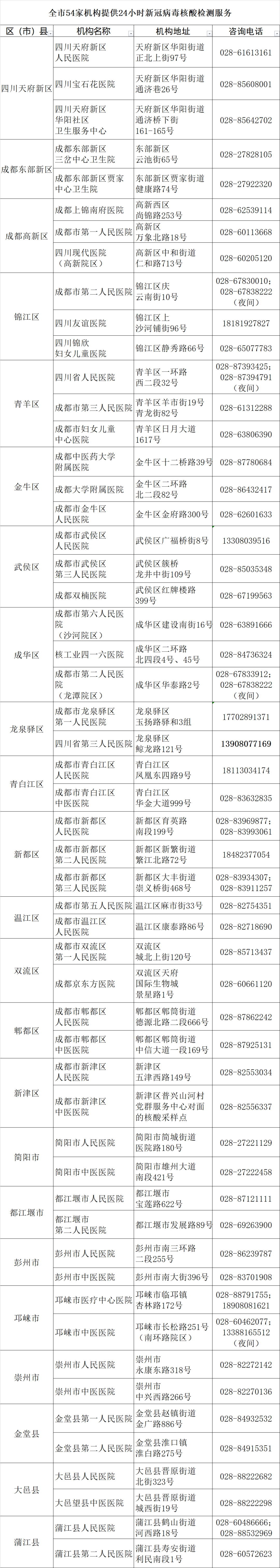 虽然您的健康码是绿码,但如果收到成都市卫健委、社治委发送的检测提示短信,也请您按要求配合做好核酸检测工作。当前,为方便市民进行新冠病毒核酸检测,全市指定54家机构提供24小时核酸采样检测服务。检测机构名单如下: