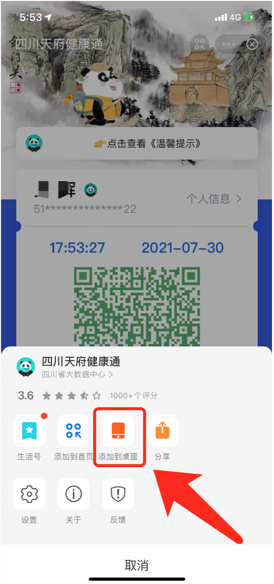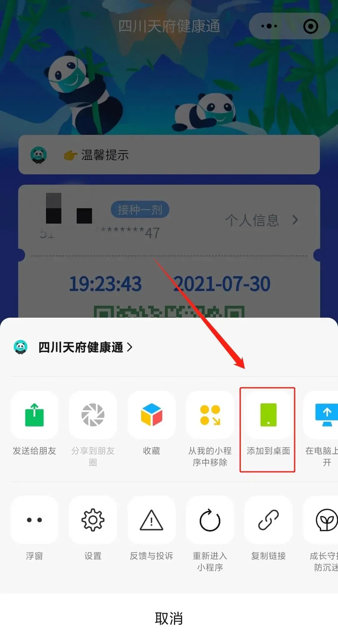 打开“四川天府健康通”小程序,点击右上角的“…”,点击“添加到桌面”