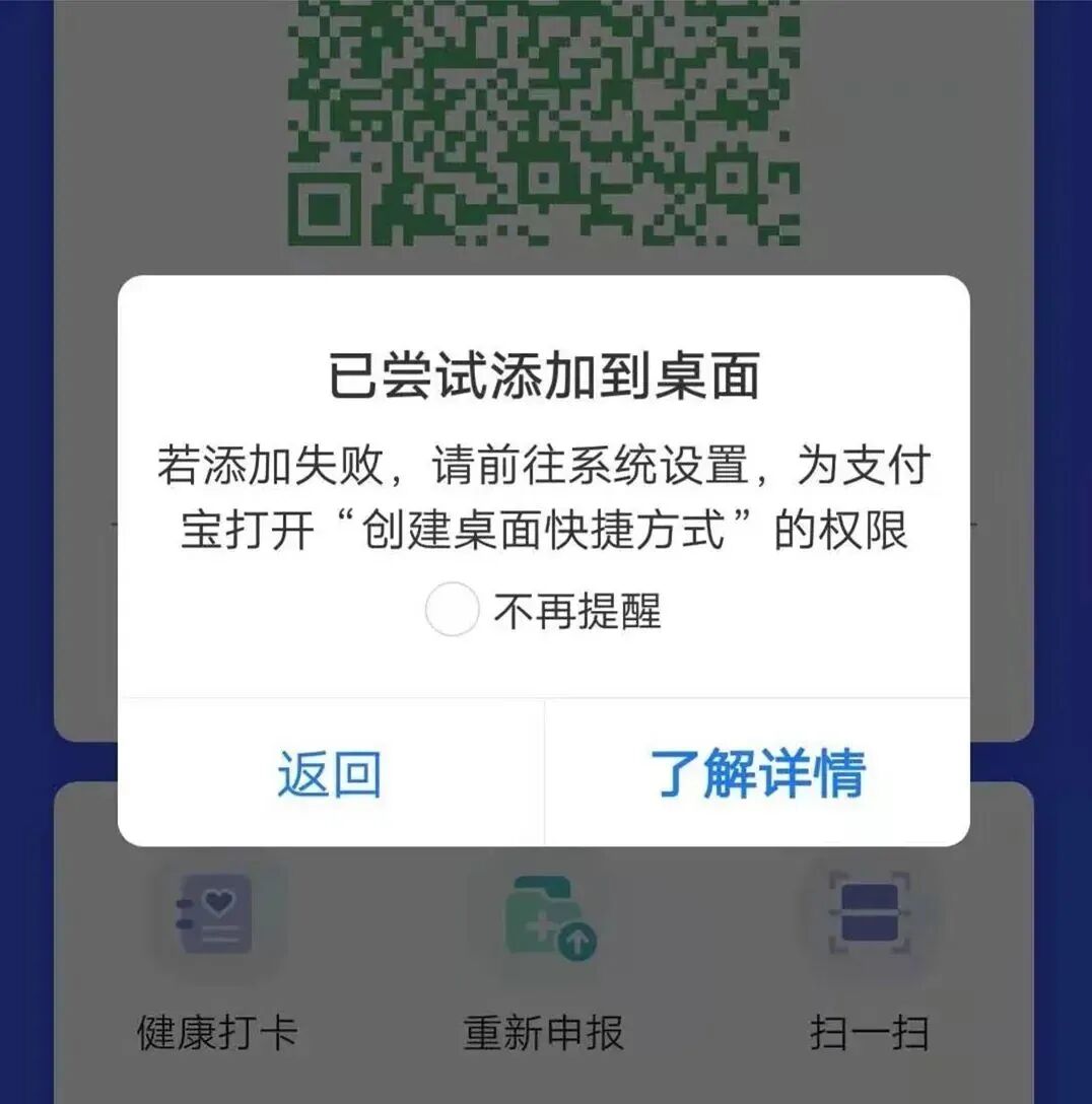 如果安卓手机用户未能成功添加到桌面,请查看手机的权限设置,为支付宝打开“创建桌面快捷方式”权限。