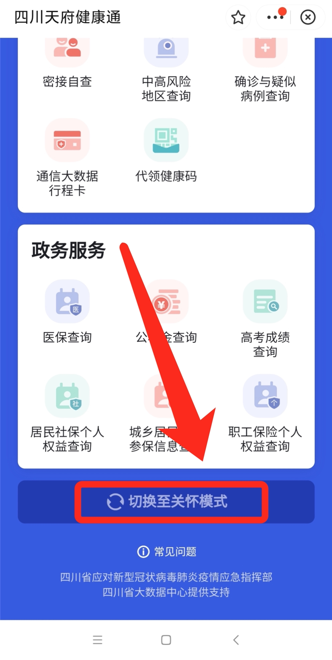 用户可通过四川天府健康通小程序选择“切换至关怀模式”,直接进入到老年人专属版本,该版本使用步骤更加简洁,量身打造的大字体,大按钮也更加符合老年人的使用习惯。