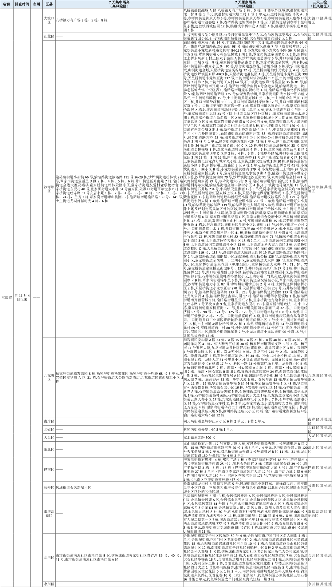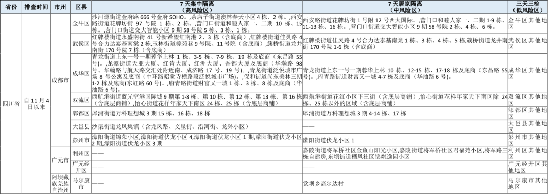 1.根据国家《新型冠状病毒肺炎防控方案(第九版)》相关要求,对近7日内有高风险区旅居史的来(返)川人员,自抵川之日起,实施7天集中隔离;对近7日内有中风险区旅居史的来(返)川人员,自抵川之日起,实施7天居家隔离。(11月10日国内高、中风险区详情,请查看文末《四川省疫情防控重点地区提示表》)