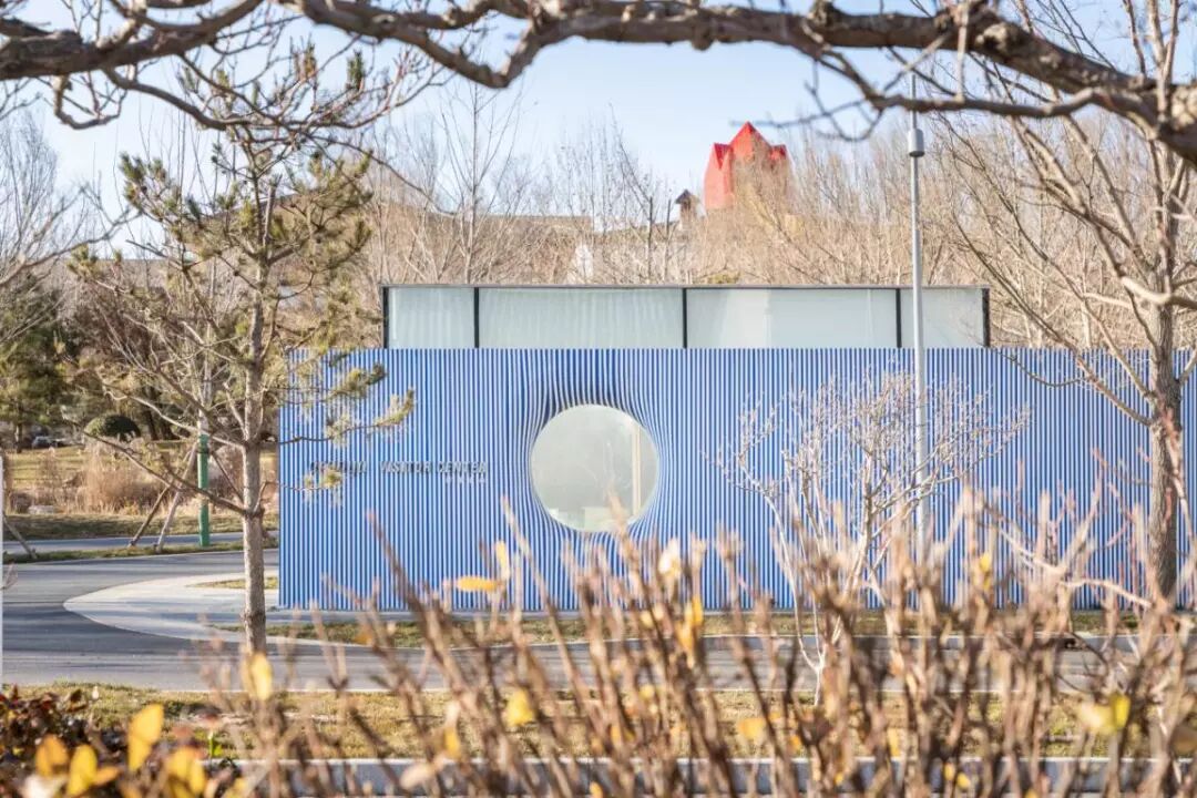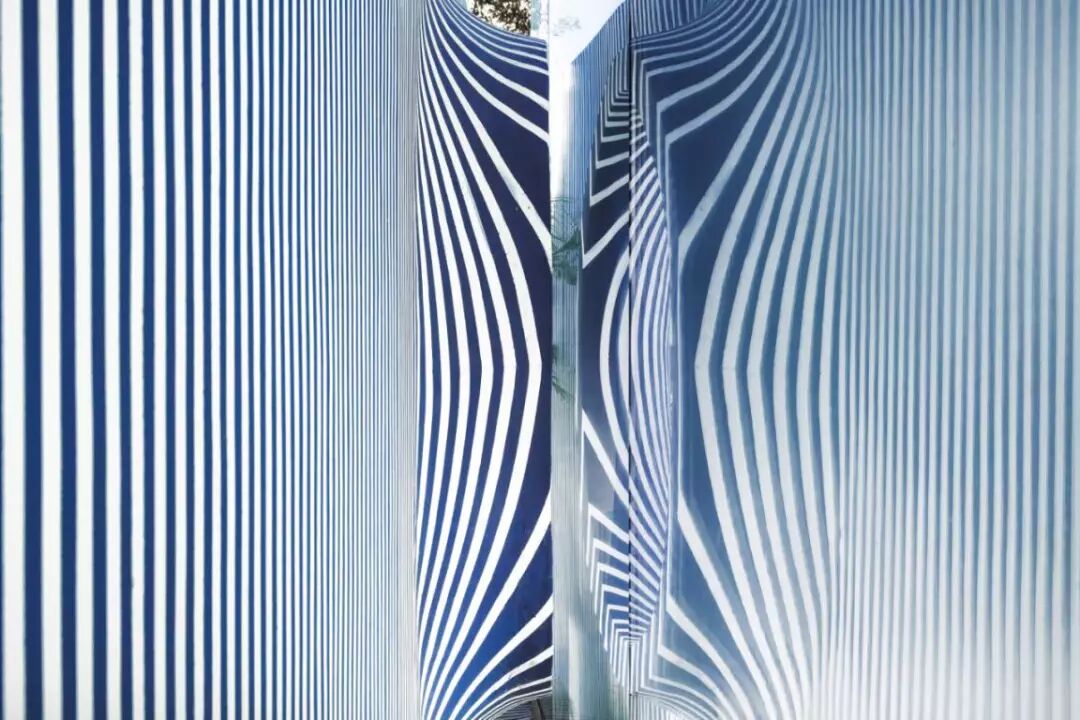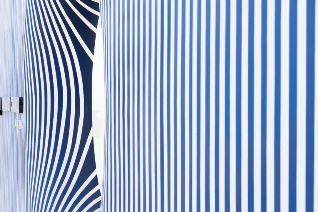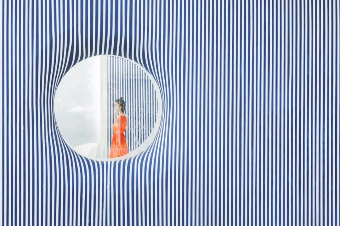 大海,这个突然触动我联系到海魂衫,这个典型的水手服装的典型图案。我决定用条纹去覆盖整个围墙和场地。没错,条纹会消弱围墙的实体感受,并创造出一种晕眩感,这晕眩感会在立面上创造一种新的不确定和暧昧,结合围墙的圆洞,和玻璃盒子内的功能发生联系。由此这个设计达成了我的实验目的。尽管手段并不是预先设定的。