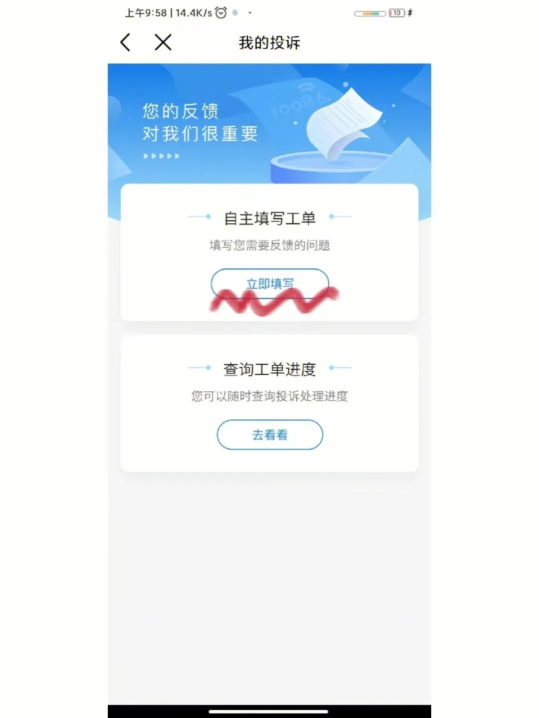 接着,在手机中打开中国移动APP(没有的先下载,并登陆),然后进入 【我的】-【我的投诉】-【自主填写工单】,点击立即填写,如图。
