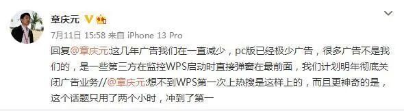 第一次,是在7月11日,章庆元就曾针对广告问题回应称:“这几年广告我们在一直减少,pc版已经极少广告,很多广告不是我们的,是一些第三方在监控WPS启动时直接弹窗在最前面,我们计划明年彻底关闭广告业务”。