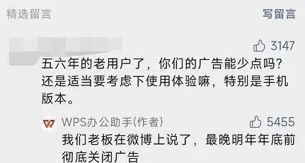 第二次,是在 WPS 官方微信公众号针对“删除用户本地文件”“侵犯用户隐私”等言论而发布声明和承诺公告的评论区,在回应广告问题时,WPS 称最晚明年年底前彻底关闭广告。