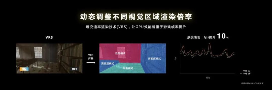 另外,Immortalis-G715还支持了VRS(可变速率渲染技术)。在适配了这一技术的游戏中,同一帧画面里的不同部位,会根据远近、玩家的关注度等因素,采取不同的渲染精度。这样一来,就能在不对游戏画面效果造成显著影响的前提下,为GPU“减负”,甚至能够起到提升10% FPS的效果。