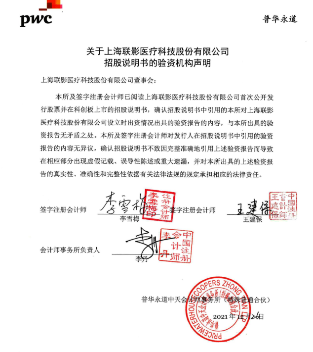 此前,12月31日联影医疗申请科创板上市获受理。中信证券和中金公司为其保荐机构,拟募资124.8亿元,每股面值1元,发行股数不超过10,000万股(行使超额配售选择权之前);不超过11,500万股(全额行使超额配售选择权后)。